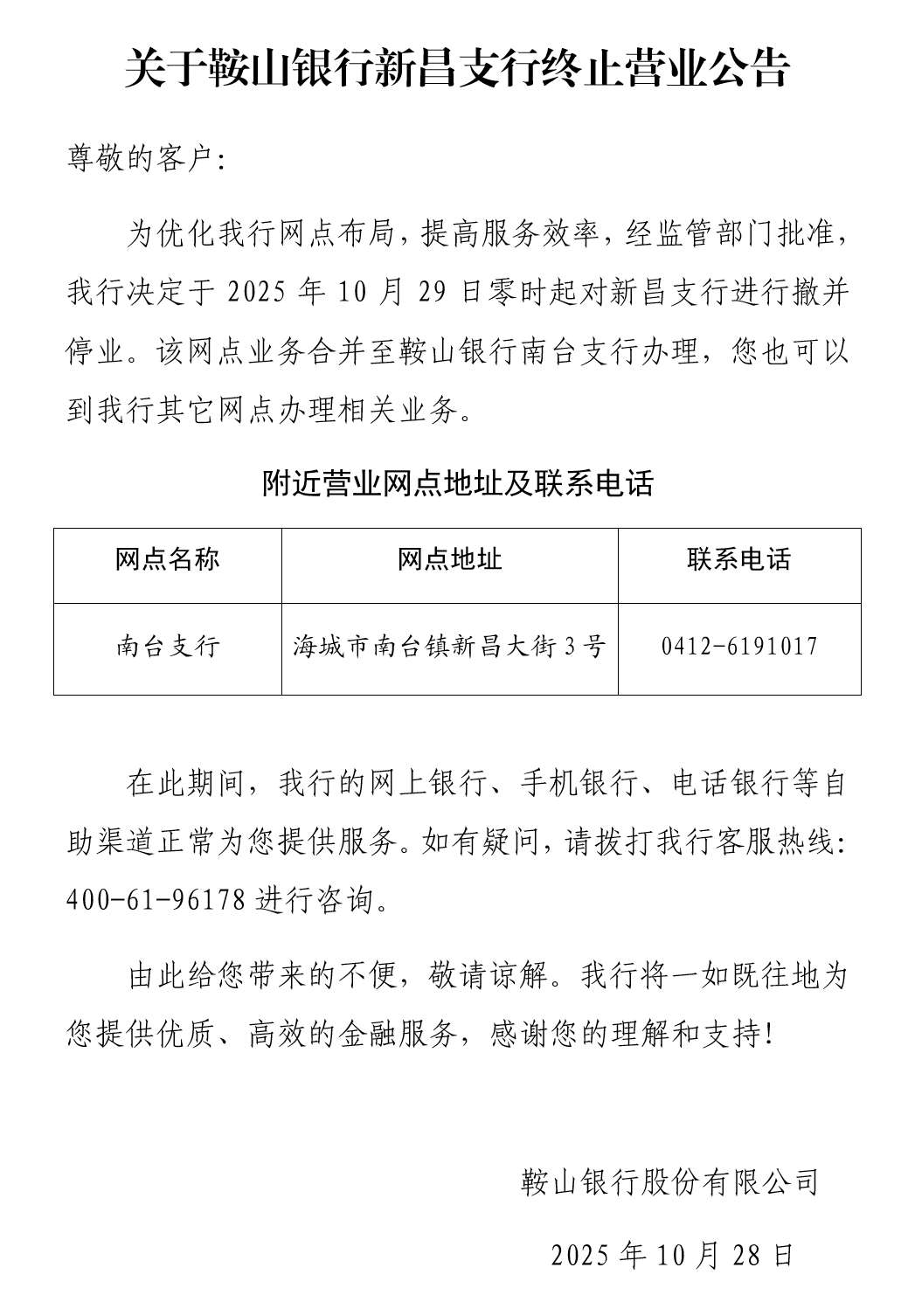 当前位置:首页 > 最新公告 >关于鞍山银行新昌支行终止营业公告